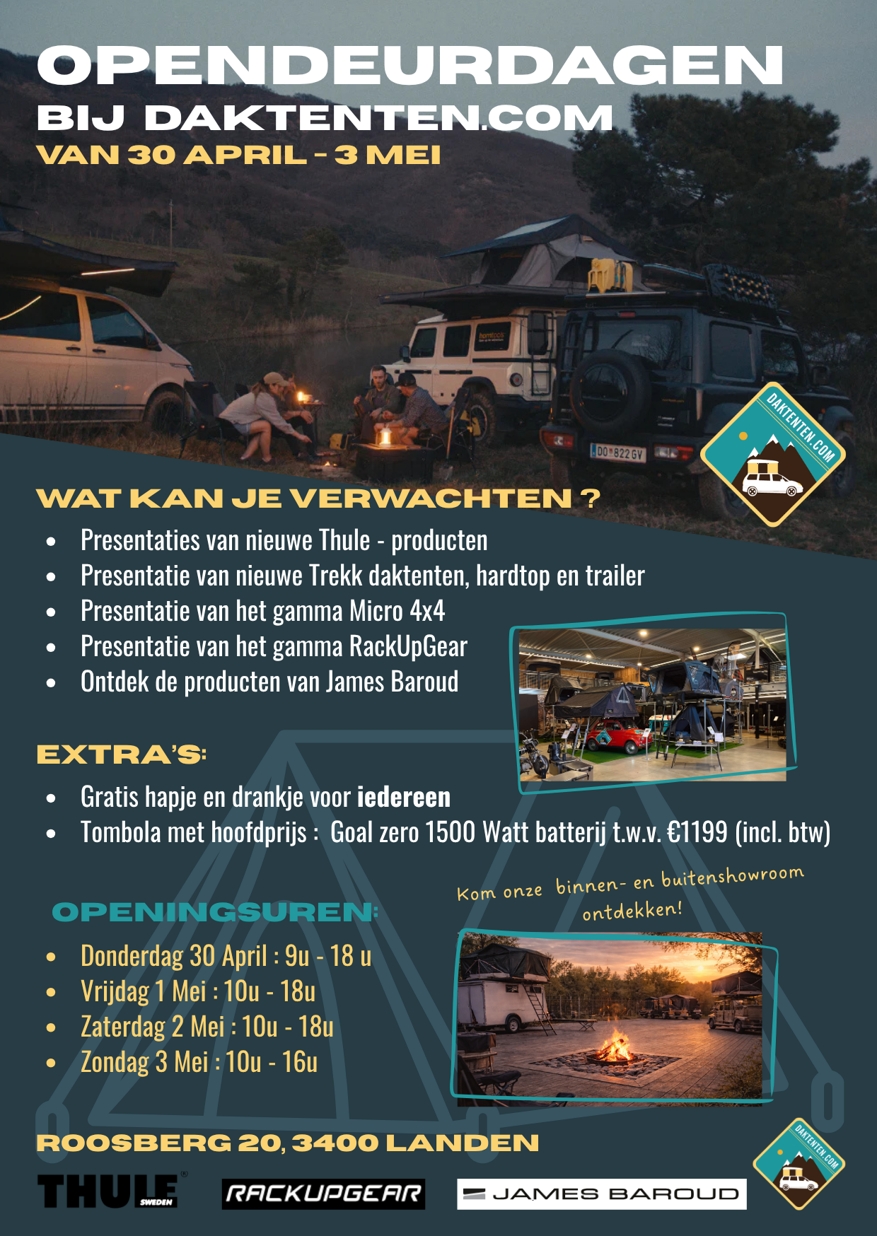On Saturday, May 14, the Thule caravan will stop at Daktenten.com in Landen. Everyone is welcome that day from 10 a.m. to 5 p.m. for demos, fun promotions and, of course, snacks and drinks in our outdoor lounge!
